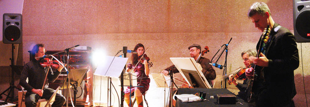 L to R: Gregor Huebner, Rachel Golub, Dave Eggar, Ron Lawrence, Nick Didkovsky. Photo by Scott Friedlander